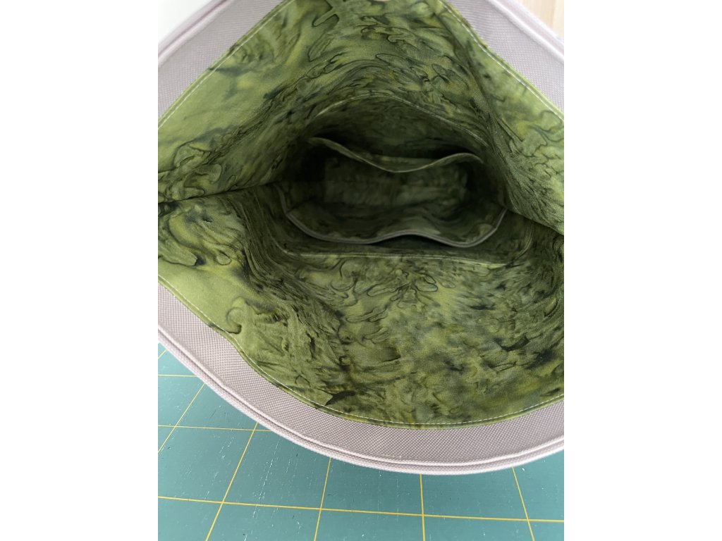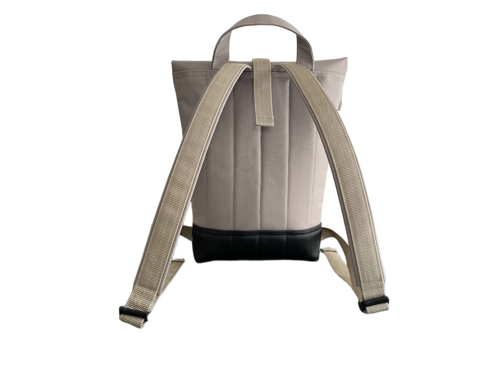 Vnější část celá z nepromokavé textilie s voděodolnou a vodoodpudivou úpravou (PVC zátěr - tzn. že z vnitřní strany béžové látky je tato strana potažena gumou/plastem). Více o tomto materiálu se dozvíte zde v blogu. V dolní části batohu černá koženka.