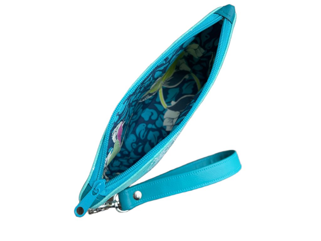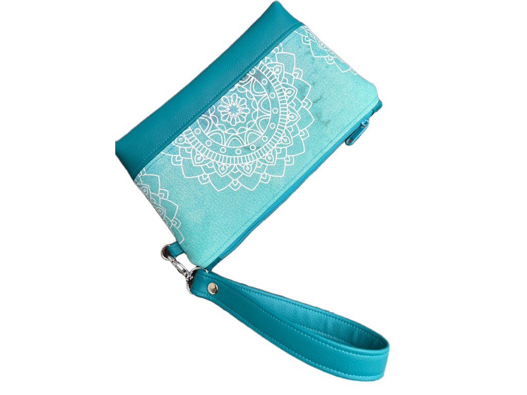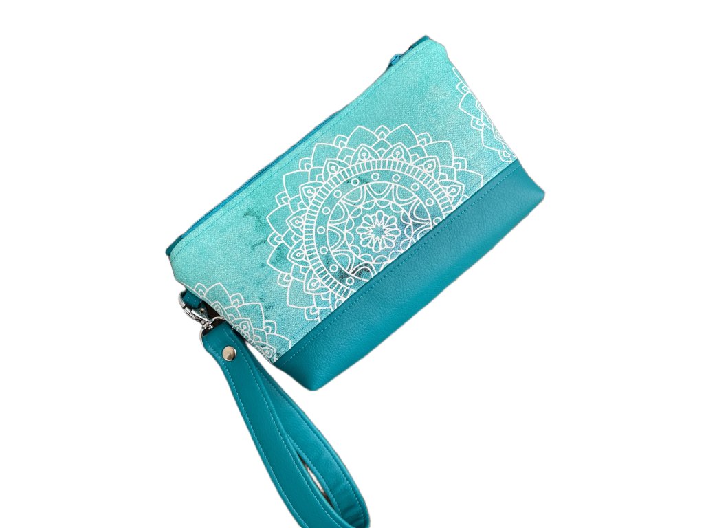 Stylová kosmetická taštička s poutkem na ruku z kvalitní koženky s motivem bílých mandal na tyrkysovém podkladu (z obou stran taštičky). Spodní část je doplněná tyrkysovou koženkou. Uvnitř je podšitá bavlněnou látkou a vyztužená, takže krásně drží tvar. Praktické zapínání na zip zajistí bezpečné uložení všech drobností – od kosmetiky přes klíče až po drobnou elektroniku.