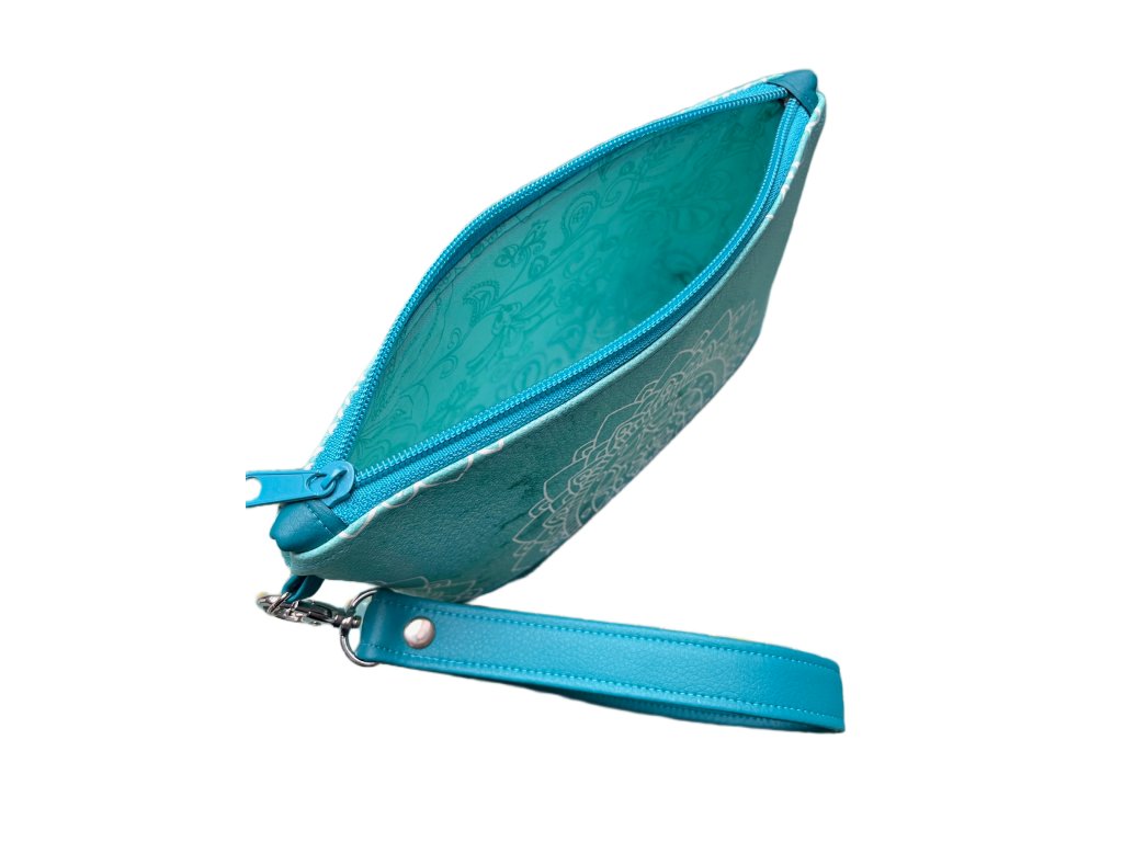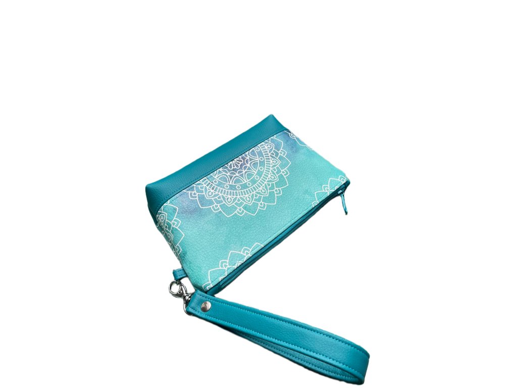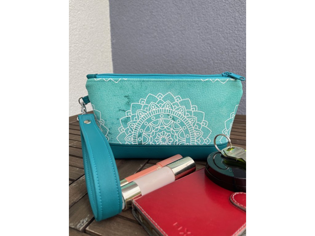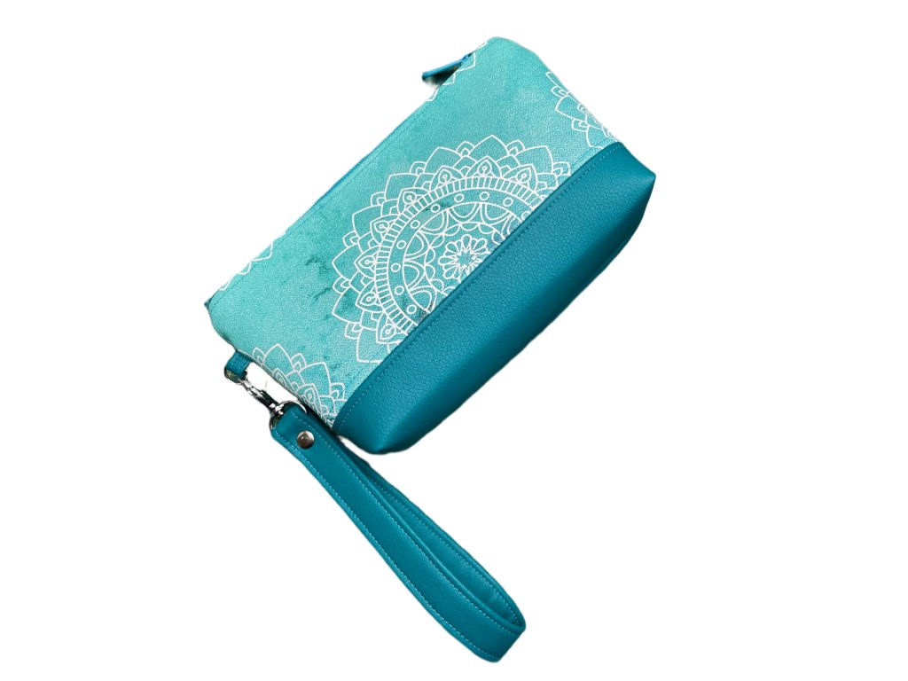 Stylová kosmetická taštička s poutkem na ruku z kvalitní koženky s motivem bílých mandal na tyrkysovém podkladu (z obou stran taštičky). Spodní část je doplněná tyrkysovou koženkou. Uvnitř je podšitá bavlněnou látkou a vyztužená, takže krásně drží tvar. Praktické zapínání na zip zajistí bezpečné uložení všech drobností – od kosmetiky přes klíče až po drobnou elektroniku.