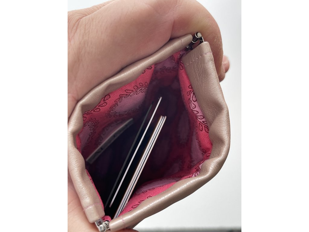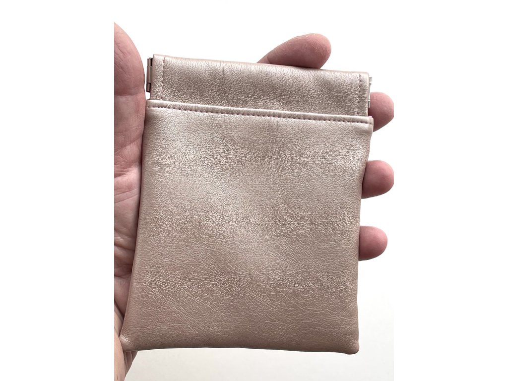Mini peněženka, tak akorát do ruky, když potřebujete sebou jen to nejnutnější na pružné perko. Zmáčknete z obou konců proti sobě a je otevřeno. Na pár mincí, složené papírové peníze a karty, event. klíče a další malé cennosti.